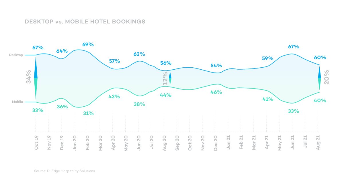 As for hotel bookings, data from Booking.com shows that 40% of hotel bookings were made via its mobile app, which has more than 100 million active users. And Skift’s research supports this kind of mobile activity. The graph below shows mobile hotel bookings were up to 7% overall between October 2019 and August 2021.
