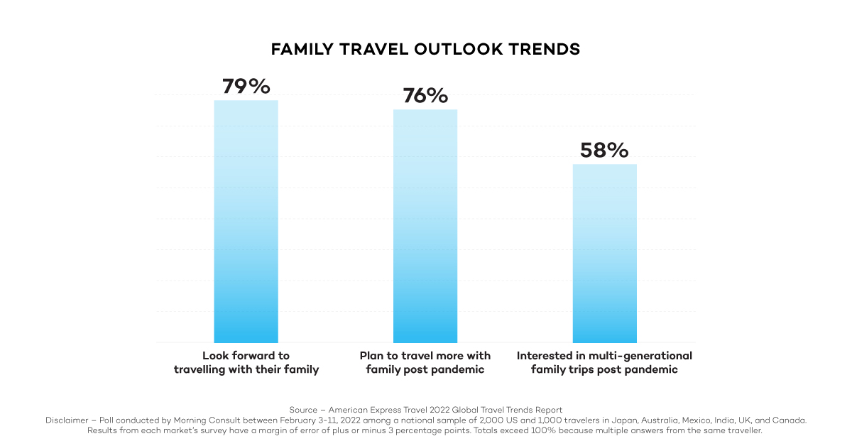 The same report shows a shift towards travelling with families, with 79% of travel consumers looking forward to travelling with family. And out of the countries surveyed and 76% of those plan to do so.