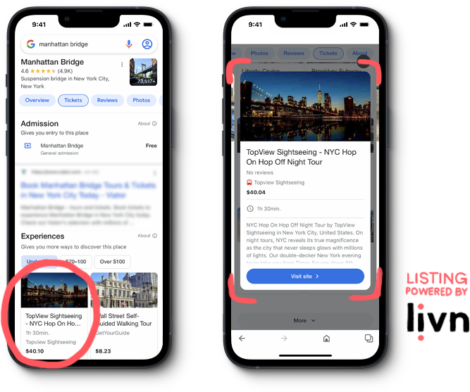 Tours, activities and attractions operators who provide meaningful experiences of these POIs can appear in Google search results alongside the POI to receive high search traffic from qualified users. For example, if you offer a walking tour that includes admission to a local landmark, Livn can help you place your products in context next to Google POIs.